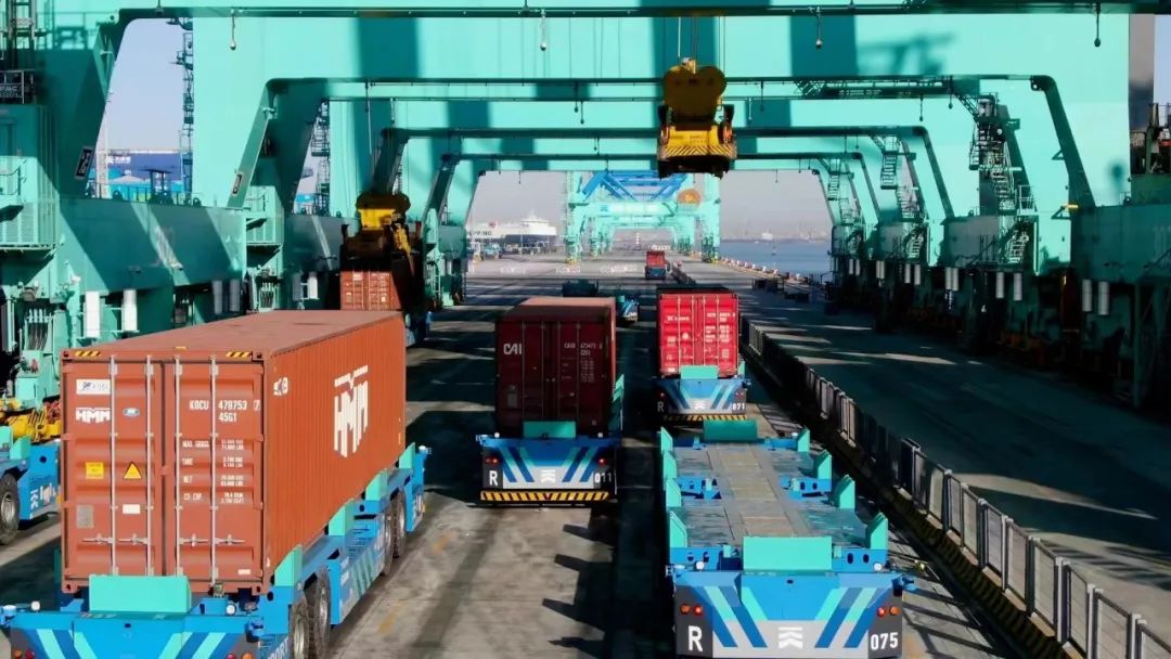 这个智慧码头厉害在哪?它是全球首个实现车路协同超L4级无人驾驶在港口规模化商用落地的码头,拥有全球首创自主研发的“智能水平运输系统”、全球首创“单小车岸桥+地面解锁站+水平堆场”的自动化码头工艺,而且这些应用的核心关键技术全部拥有自主知识产权。从造价看,传统自动化桥吊每台重约2500吨,北疆港区C段的桥吊只有约1400吨,再不需要像传统自动化码头那样埋磁钉导航,码头的整体造价成本大幅降低。