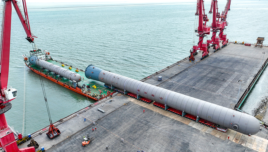 6月8日,装载天津南港乙烯项目首台大型设备配件的“恒基88”轮,缓缓驶入天津南港工业区通用泊位7#码头,该船所装载两台设备总重量达2130吨,本次作业打破了南港港务公司接卸最大载重设备纪录。